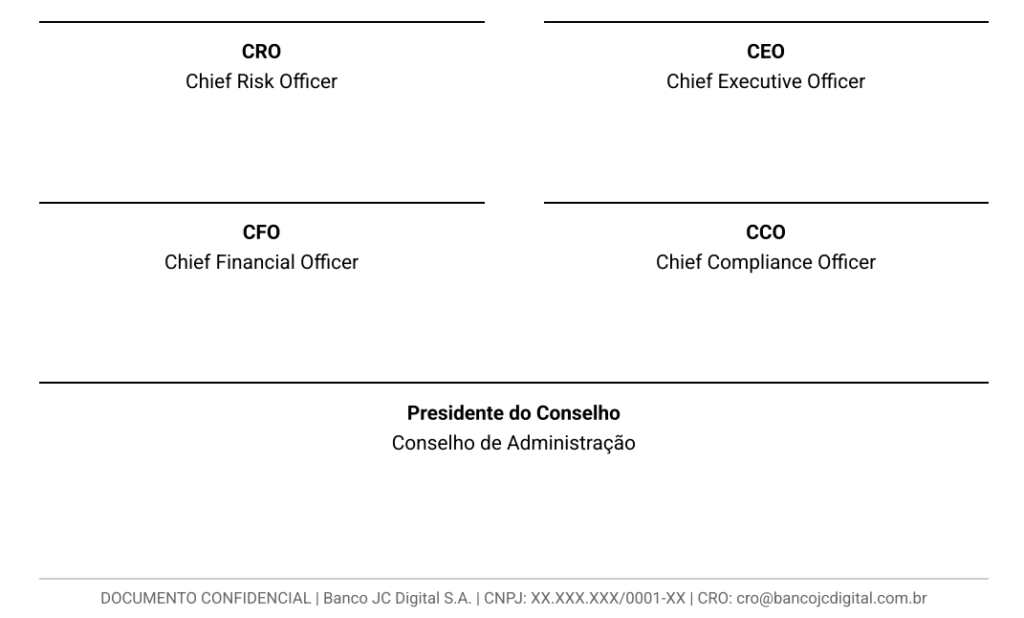 Possui a responsabilidade final pela aprovação da Política de Gestão de Riscos, pela definição do Apetite ao Risco (RAS) e pela supervisão da estrutura de capital.