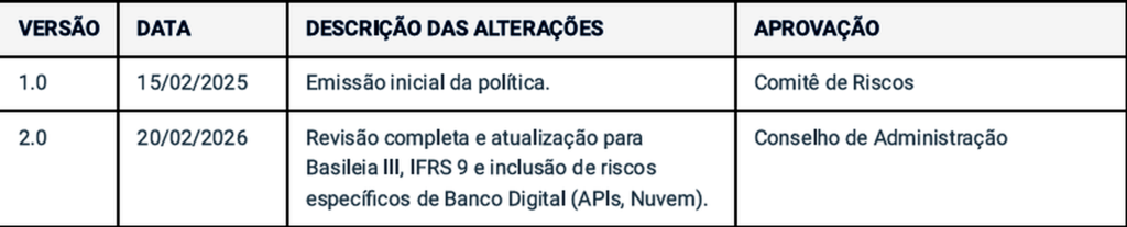Esta política deve ser revisada anualmente (em Janeiro) pelo CRO e aprovada pelo Conselho de Administração. Revisões extraordinárias ocorrem em caso de mudanças regulatórias, alteração no modelo de negócio ou perdas relevantes.