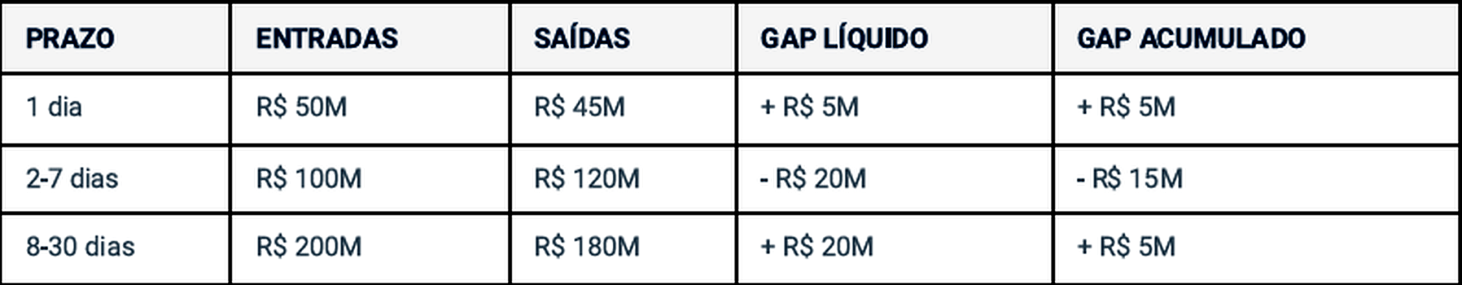 O gap acumulado não pode ser negativo em nenhuma faixa temporal crítica (até 30 dias).