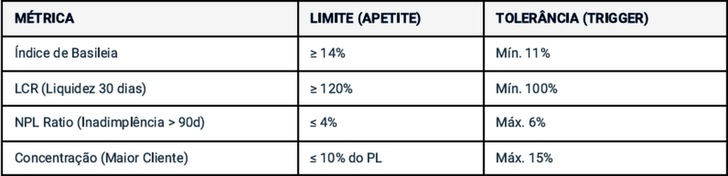 O Banco opera com níveis de capital e liquidez que garantam sua solvência mesmo em cenários de estresse severo. Toleramos volatilidade moderada em receitas, mas temos tolerância mínima para riscos que ameacem a reputação ou a licença bancária.