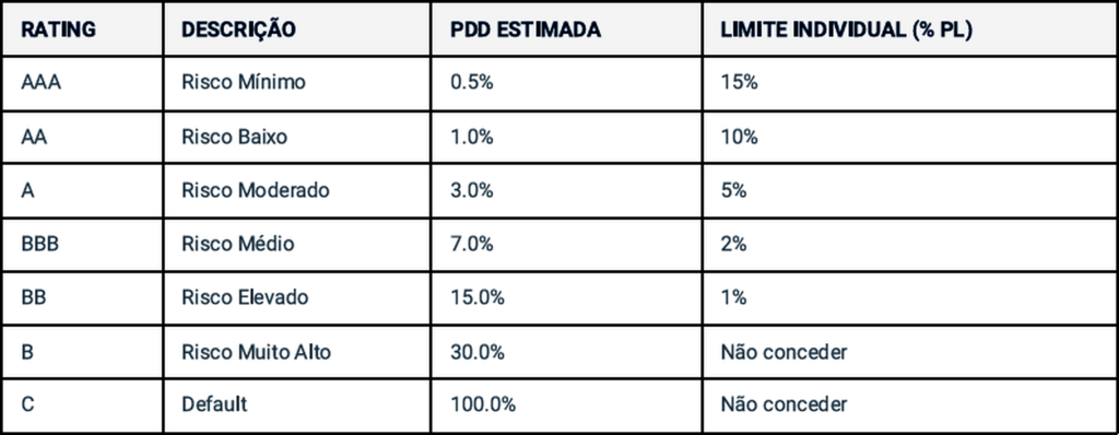 O cálculo de PDD segue o modelo de Perda Esperada (Expected Credit Loss – ECL):