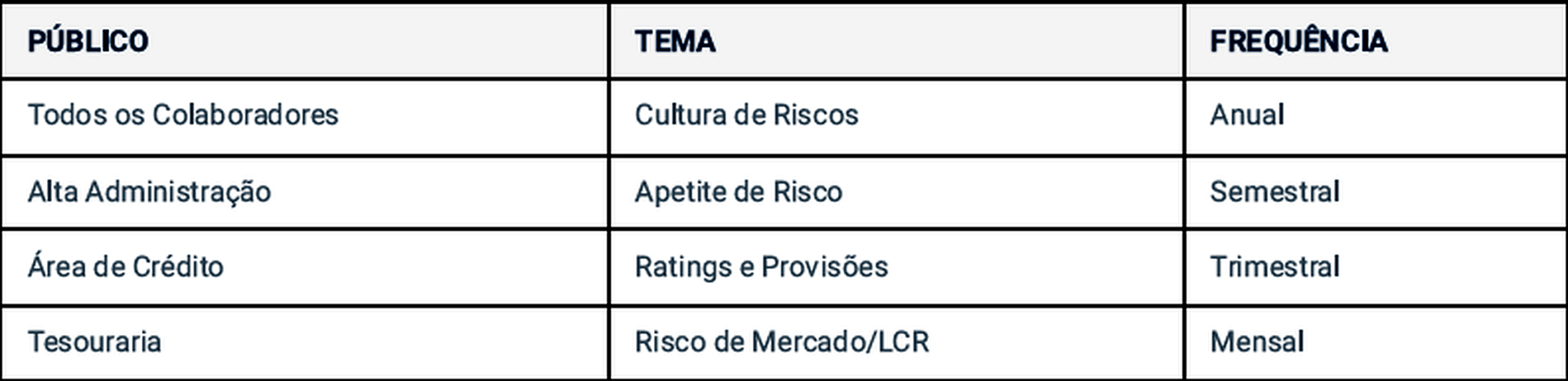 Semanal para o Comitê Executivo e mensal para o Comitê de Riscos e Conselho.