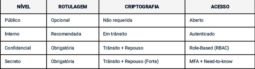 ■ SECRETO: Nível máximo de proteção; acesso extremamente restrito (por exemplo, chaves criptográficas mestre, senhas administrativas, dados sensíveis de clientes VIP e investigações em curso).