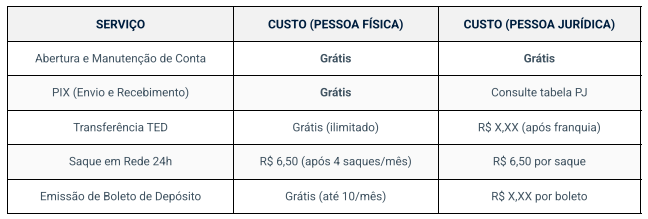 Prezamos pela clareza. A tabela completa de tarifas está disponível no App (Menu > Tarifas) e em nosso site. Confira abaixo um resumo dos principais serviços: