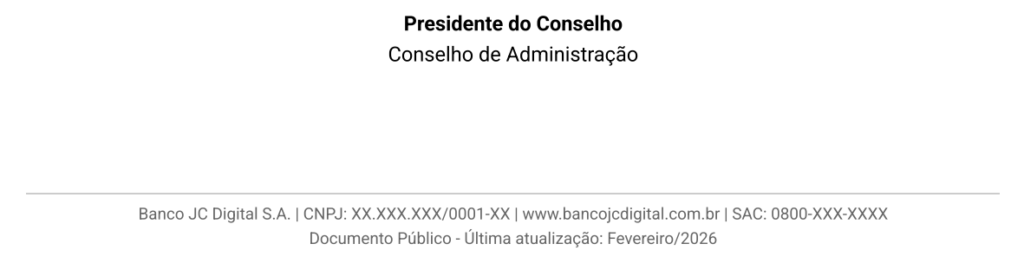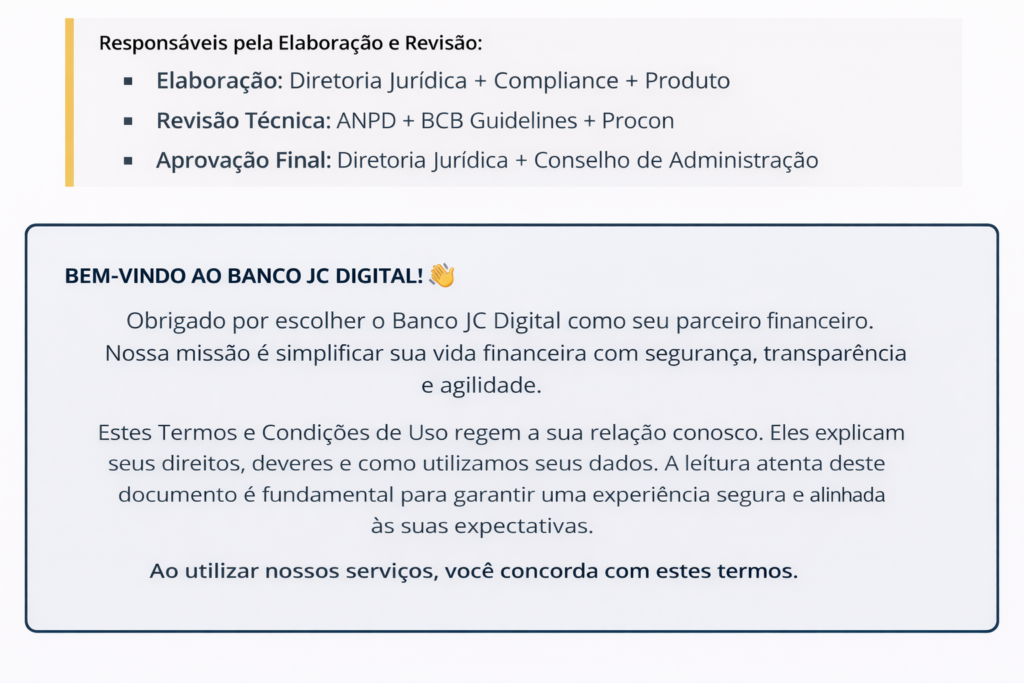 Estes Termos regulam o acesso e uso da Plataforma Digital do Banco JC Digital e a prestação dos serviços financeiros oferecidos.